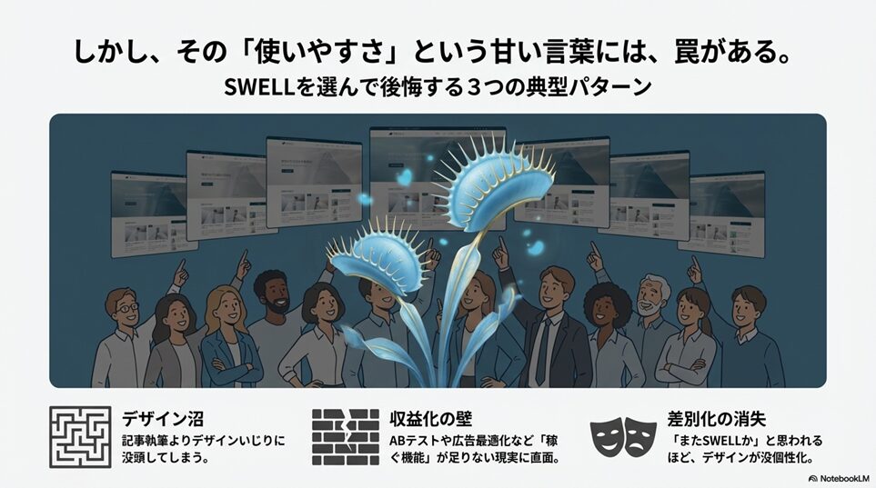 ※本ページはプロモーションが含まれていますブログ内検索 「使いやすさ」という罠|SWELLを選んで後悔する人の共通点 2025年12月28日 Twitter Share Pocket Hatena LINE URLコピー Twitter Share Pocket Hatena LINE URLコピーこの記事を書いた人 孔雀2004年にアフィリ業界に参入。 2017年から脱サラし、専業アフィリエイターに転職。 ほぼ独学でSEO、マーケティングを学び、2018年6月にアフィリエイトのみで月収50万円を達成。 誰にも縛られない自由な生活を求めて日々精進中。 最終目標は、何もせずに収入が入ってくる不労所得を作り出すこと。 -