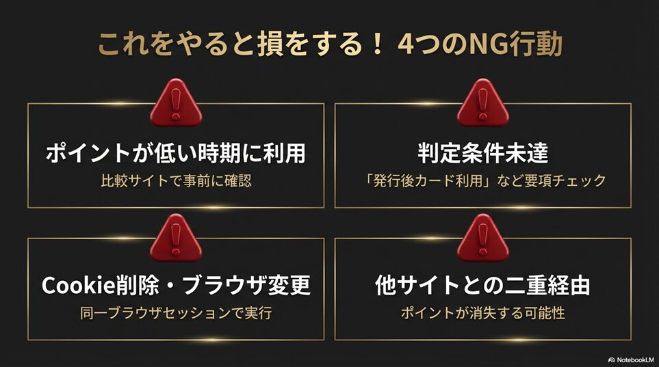 ※本ページはプロモーションが含まれていますブログ内検索 【注意点】これをやると損する!ハピタスのゴールド会員へのNG行動リスト 2026年1月13日 Twitter Share Pocket Hatena LINE URLコピー Twitter Share Pocket Hatena LINE URLコピーこの記事を書いた人 孔雀2004年にアフィリ業界に参入。 2017年から脱サラし、専業アフィリエイターに転職。 ほぼ独学でSEO、マーケティングを学び、2018年6月にアフィリエイトのみで月収50万円を達成。 誰にも縛られない自由な生活を求めて日々精進中。 最終目標は、何もせずに収入が入ってくる不労所得を作り出すこと。 -
