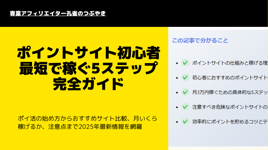 ※本ページはプロモーションが含まれていますブログ内検索 【2025年最新】ポイントサイト初心者が最短で稼ぐ5ステップ完全ガイド 2025年10月25日 Twitter Share Pocket Hatena LINE URLコピー Twitter Share Pocket Hatena LINE URLコピーこの記事を書いた人 孔雀2004年にアフィリ業界に参入。 2017年から脱サラし、専業アフィリエイターに転職。 ほぼ独学でSEO、マーケティングを学び、2018年6月にアフィリエイトのみで月収50万円を達成。 誰にも縛られない自由な生活を求めて日々精進中。 最終目標は、何もせずに収入が入ってくる不労所得を作り出すこと。 -