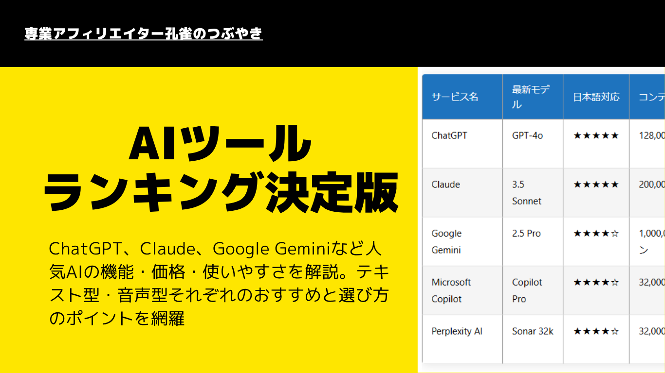※本ページはプロモーションが含まれていますブログ内検索 【2025年最新】AIツールランキング決定版!機能・価格・使いやすさを徹底比較 2025年10月9日 Twitter Share Pocket Hatena LINE URLコピー Twitter Share Pocket Hatena LINE URLコピーこの記事を書いた人 孔雀2004年にアフィリ業界に参入。 2017年から脱サラし、専業アフィリエイターに転職。 ほぼ独学でSEO、マーケティングを学び、2018年6月にアフィリエイトのみで月収50万円を達成。 誰にも縛られない自由な生活を求めて日々精進中。 最終目標は、何もせずに収入が入ってくる不労所得を作り出すこと。 -