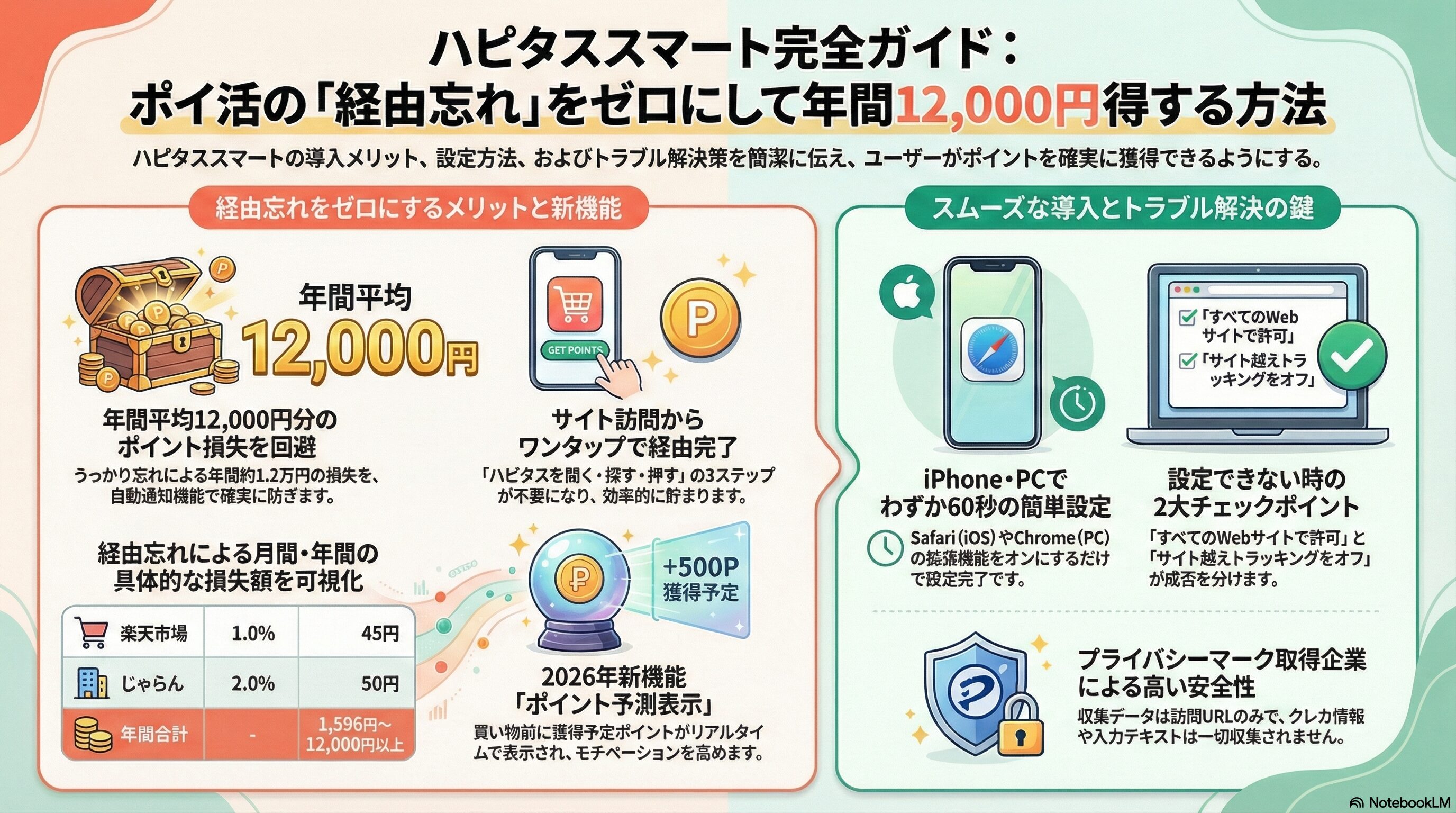 ※本ページはプロモーションが含まれていますブログ内検索 【2026年最新】ハピタススマート完全ガイド|設定方法・できない時の解決策・500pt獲得術 2026年2月13日 Twitter Share Pocket Hatena LINE URLコピー Twitter Share Pocket Hatena LINE URLコピーこの記事を書いた人 孔雀2004年にアフィリ業界に参入。 2017年から脱サラし、専業アフィリエイターに転職。 ほぼ独学でSEO、マーケティングを学び、2018年6月にアフィリエイトのみで月収50万円を達成。 誰にも縛られない自由な生活を求めて日々精進中。 最終目標は、何もせずに収入が入ってくる不労所得を作り出すこと。 -