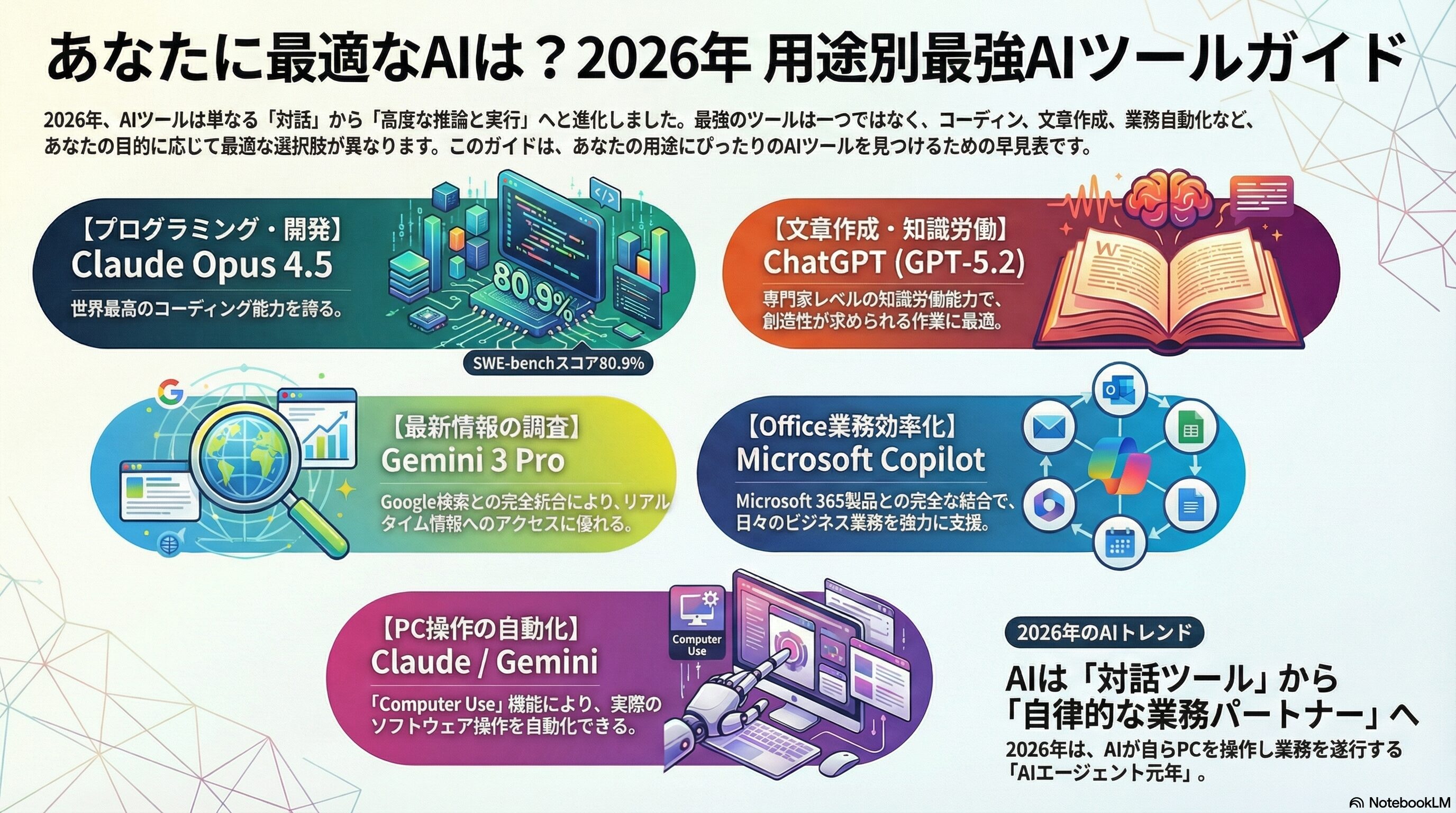 ※本ページはプロモーションが含まれていますブログ内検索 【2026年最新】AIツールおすすめ比較ランキングTOP5!Claude 4.5やGPT-5、Computer Use機能まで徹底解説 2026年1月8日 Twitter Share Pocket Hatena LINE URLコピー Twitter Share Pocket Hatena LINE URLコピーこの記事を書いた人 孔雀2004年にアフィリ業界に参入。 2017年から脱サラし、専業アフィリエイターに転職。 ほぼ独学でSEO、マーケティングを学び、2018年6月にアフィリエイトのみで月収50万円を達成。 誰にも縛られない自由な生活を求めて日々精進中。 最終目標は、何もせずに収入が入ってくる不労所得を作り出すこと。 -