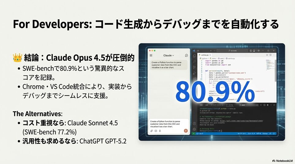 ※本ページはプロモーションが含まれていますブログ内検索 プログラミング・コーディングに最適なAI 2026年1月9日 Twitter Share Pocket Hatena LINE URLコピー Twitter Share Pocket Hatena LINE URLコピーこの記事を書いた人 孔雀2004年にアフィリ業界に参入。 2017年から脱サラし、専業アフィリエイターに転職。 ほぼ独学でSEO、マーケティングを学び、2018年6月にアフィリエイトのみで月収50万円を達成。 誰にも縛られない自由な生活を求めて日々精進中。 最終目標は、何もせずに収入が入ってくる不労所得を作り出すこと。 -