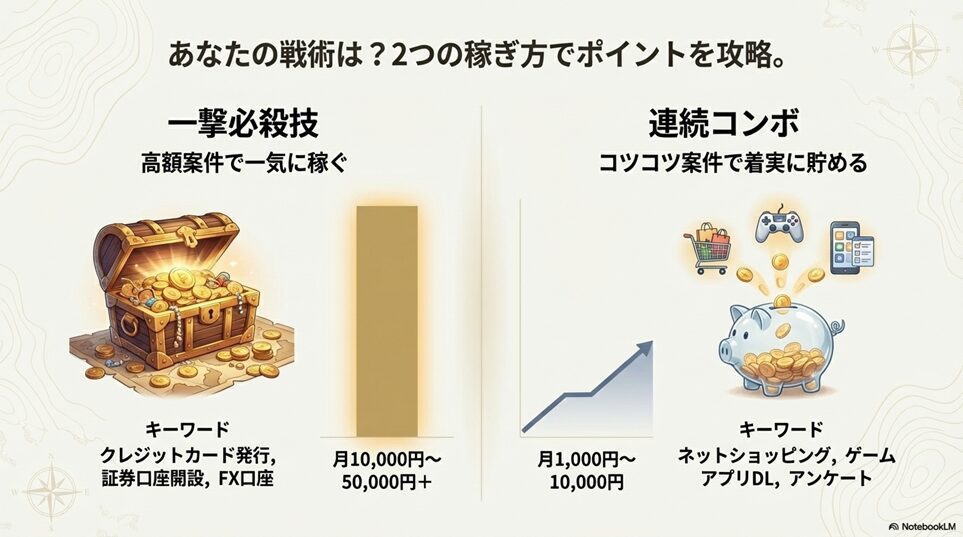 ※本ページはプロモーションが含まれていますブログ内検索 ポイントサイトのおすすめ案件効率的な稼ぎ方完全ガイド 2026年1月4日 Twitter Share Pocket Hatena LINE URLコピー Twitter Share Pocket Hatena LINE URLコピーこの記事を書いた人 孔雀2004年にアフィリ業界に参入。 2017年から脱サラし、専業アフィリエイターに転職。 ほぼ独学でSEO、マーケティングを学び、2018年6月にアフィリエイトのみで月収50万円を達成。 誰にも縛られない自由な生活を求めて日々精進中。 最終目標は、何もせずに収入が入ってくる不労所得を作り出すこと。 -