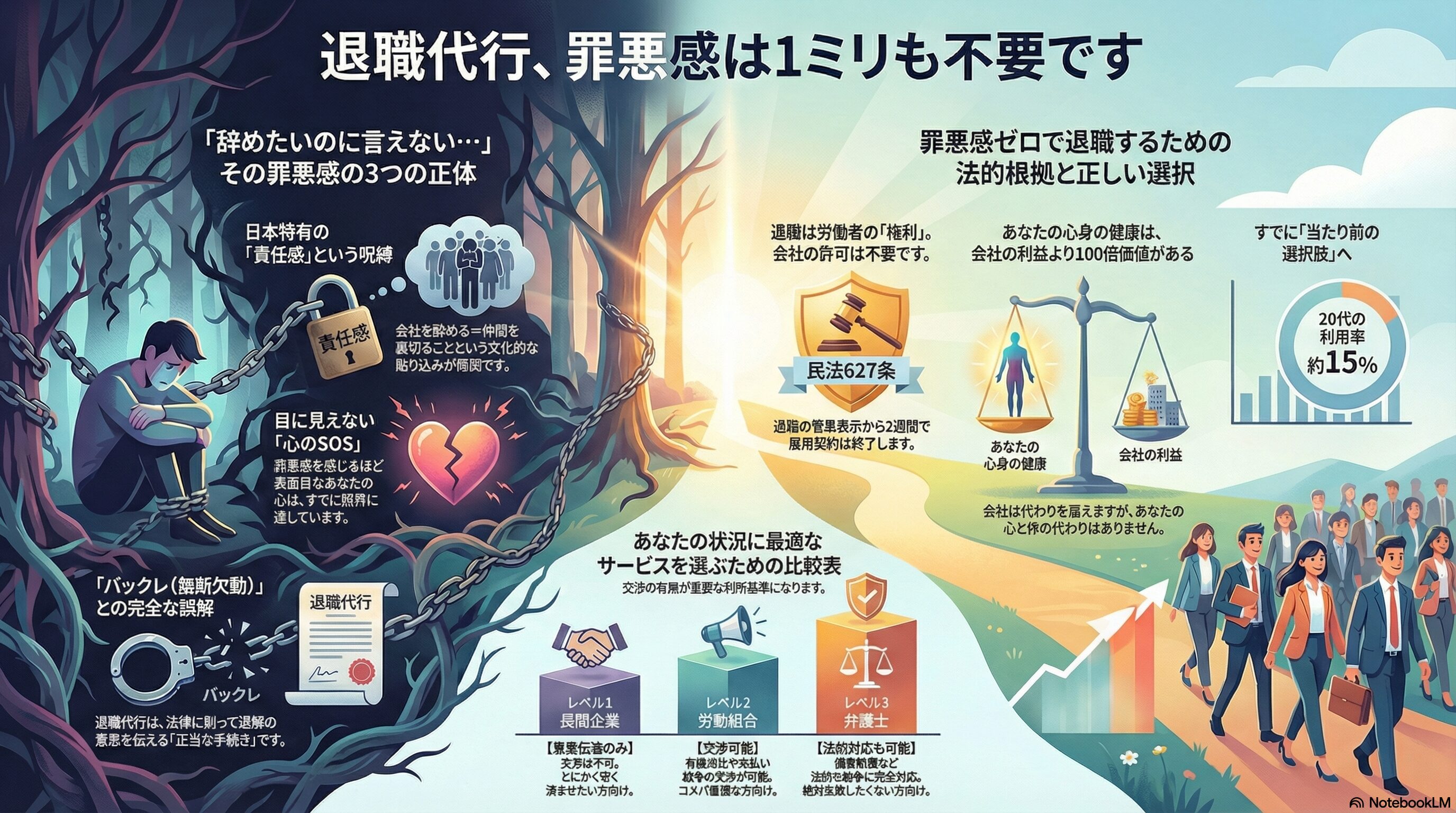 ※本ページはプロモーションが含まれていますブログ内検索 退職代行に罪悪感は1ミリも不要│2026年最新版・心理メカニズムと法的根拠で完全解説 2026年1月12日 Twitter Share Pocket Hatena LINE URLコピー Twitter Share Pocket Hatena LINE URLコピーこの記事を書いた人 孔雀2004年にアフィリ業界に参入。 2017年から脱サラし、専業アフィリエイターに転職。 ほぼ独学でSEO、マーケティングを学び、2018年6月にアフィリエイトのみで月収50万円を達成。 誰にも縛られない自由な生活を求めて日々精進中。 最終目標は、何もせずに収入が入ってくる不労所得を作り出すこと。 -