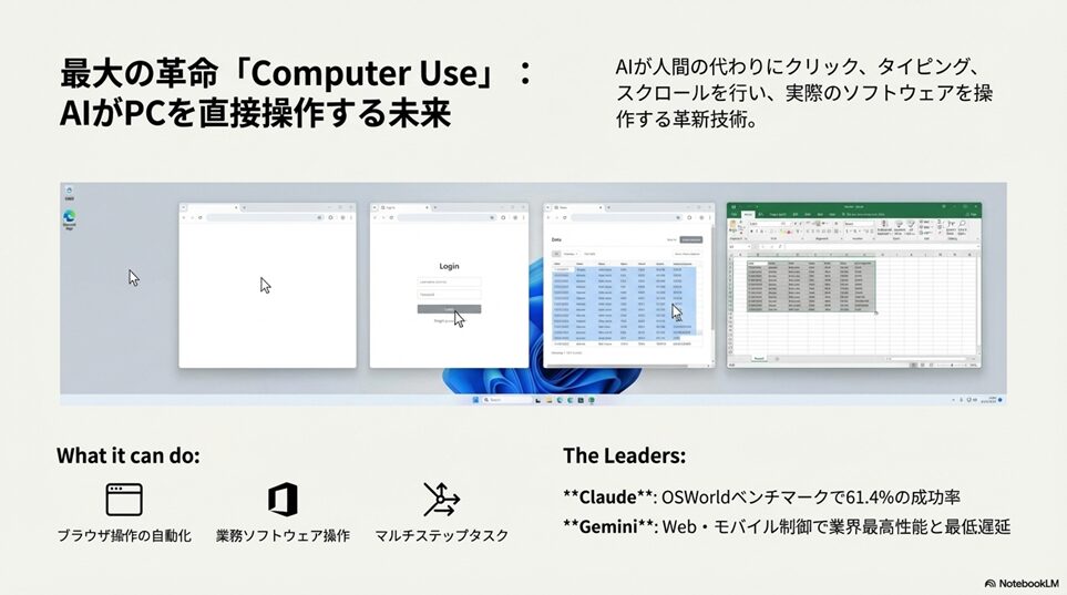 ※本ページはプロモーションが含まれていますブログ内検索 Computer Use機能とは?実際に何ができるのか 2026年1月9日 Twitter Share Pocket Hatena LINE URLコピー Twitter Share Pocket Hatena LINE URLコピーこの記事を書いた人 孔雀2004年にアフィリ業界に参入。 2017年から脱サラし、専業アフィリエイターに転職。 ほぼ独学でSEO、マーケティングを学び、2018年6月にアフィリエイトのみで月収50万円を達成。 誰にも縛られない自由な生活を求めて日々精進中。 最終目標は、何もせずに収入が入ってくる不労所得を作り出すこと。 -