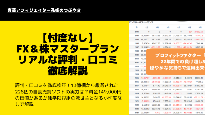 FX&株 マスタープランの評判・口コミを徹底検証!13億個から厳選された228個の自動売買ソフトの実力は?料金149,000円の価値があるか独学限界組の救世主となるか忖度なしで解説