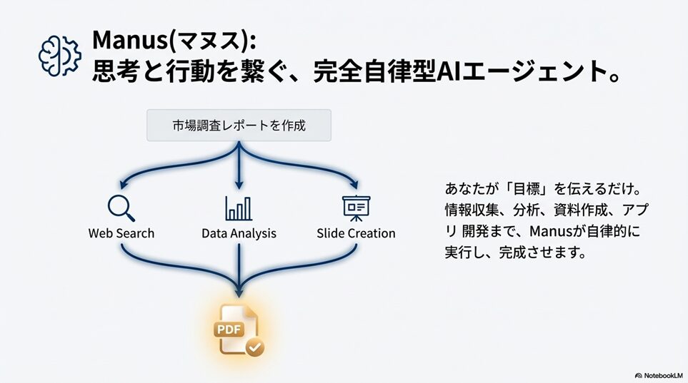 ※本ページはプロモーションが含まれていますブログ内検索 Manus(マヌス)とは?自律型AIエージェントの全体像 2025年12月20日 Twitter Share Pocket Hatena LINE URLコピー Twitter Share Pocket Hatena LINE URLコピーこの記事を書いた人 孔雀2004年にアフィリ業界に参入。 2017年から脱サラし、専業アフィリエイターに転職。 ほぼ独学でSEO、マーケティングを学び、2018年6月にアフィリエイトのみで月収50万円を達成。 誰にも縛られない自由な生活を求めて日々精進中。 最終目標は、何もせずに収入が入ってくる不労所得を作り出すこと。 -