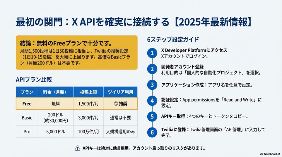 ※本ページはプロモーションが含まれていますブログ内検索 X API(Twitter API)キーの取得・設定手順【2025年12月最新版】 2025年12月6日 Twitter Share Pocket Hatena LINE URLコピー Twitter Share Pocket Hatena LINE URLコピーこの記事を書いた人 孔雀2004年にアフィリ業界に参入。 2017年から脱サラし、専業アフィリエイターに転職。 ほぼ独学でSEO、マーケティングを学び、2018年6月にアフィリエイトのみで月収50万円を達成。 誰にも縛られない自由な生活を求めて日々精進中。 最終目標は、何もせずに収入が入ってくる不労所得を作り出すこと。 -